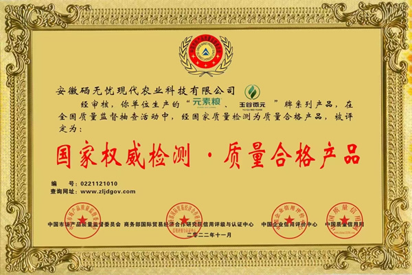 我公司生產的“元素糧”、“玉谷微元”牌系列產品,在全國質量監督抽查活動中,經國家質量檢測為質量合格產品,被評定為:國家權威檢測.質量合格產品。
